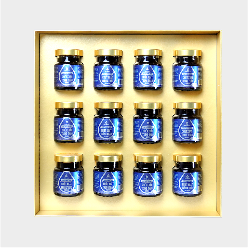 – Bên trong là 12 hũ nước chiết xuất trùng thảo Fucoidan GICOMUS 70ml
